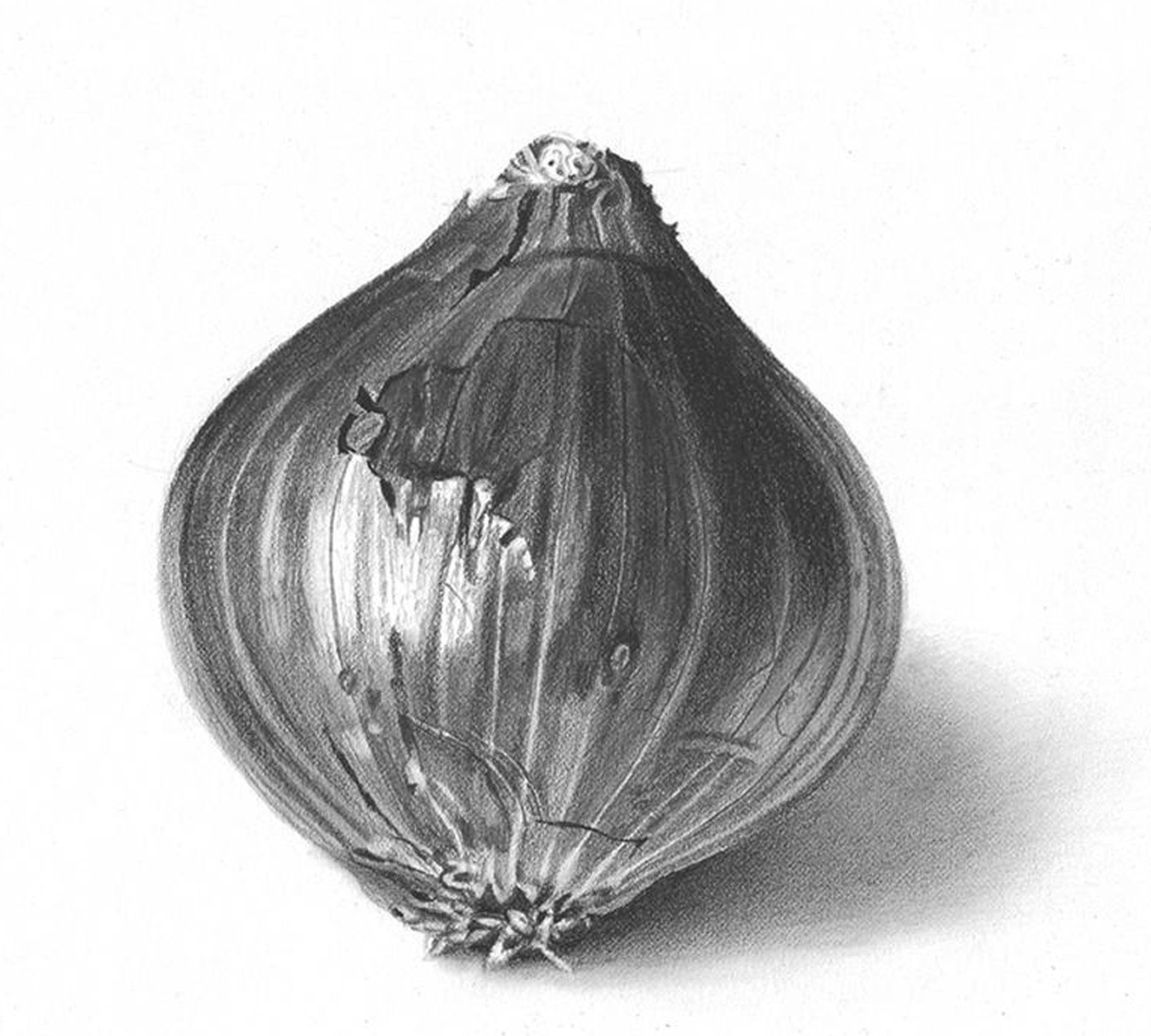 Practice drawing a realistic onion to learn roundity, layering, and light effects.